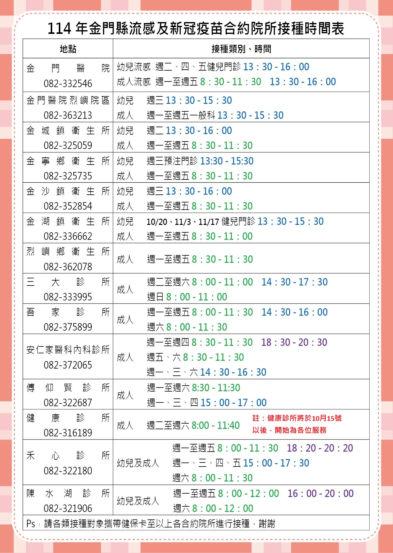 金沙鎮衛生所 暨 金東醫療 114年10月門診表出爐